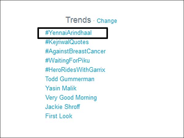 ட்விட்டரில் இதுவரை 50 ஆயிரம் ட்வீட்டுகளுக்கு மேல் என்னை அறிந்தால் பற்றி வந்துவிட்டன. இந்திய அளவில் ட்விட்டர் ட்ரெண்டில் என்னை அறிந்தால் என்ற தலைப்புதான் இன்று முதலிடத்தில் உள்ளது.