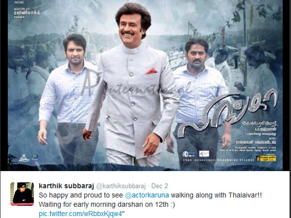 கருணாகரனை லிங்காவில் ரஜினிக்கு அருகில் பார்க்க மகிழ்ச்சியாகவும், பெருமையாகவும் உள்ளதாக கார்த்திக் ட்விட்டரில் தெரிவித்துள்ளார். மேலும் டிசம்பர் 12ம் தேதி அதிகாலை தரிசனத்திற்காக காத்துக் கொண்டிருப்பதாகவும் அவர் மேலும் தெரிவித்துள்ளார்.