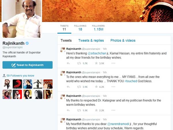 இதற்கெல்லாம் நன்றி தெரிவித்து, ரஜினிகாந்த் தனது ட்விட்டர் பக்கத்தில் நான்கு ட்வீட்டுகளை வெளியிட்டுள்ளார்.