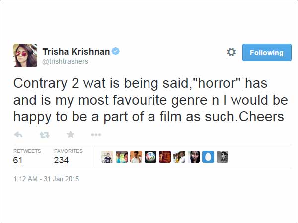 பேய் படங்கள் பற்றி த்ரிஷா ட்விட்டரில் கூறியிருப்பதாவது,