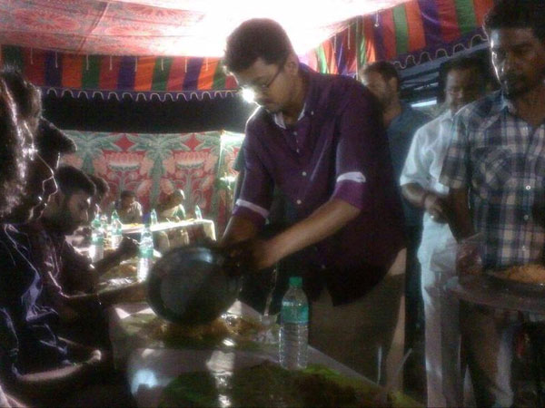விஜய் படக்குழுவினர் 700 பேருக்கும் தனது கைப்பட பிரியாணி பரிமாறி சாப்பிட வைத்தார். லைட்மேன்கள், துணை நடிகர், நடிகைகள், ஸ்டண்ட் நடிகர்கள், டிரைவர்கள், உதவி இயக்குனர்கள் உள்பட பலரும் விருந்து சாப்பிட்டார்கள்.