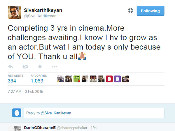 சிவகார்த்திகேயன் பெரிய திரைக்கு வந்து மூன்று ஆண்டுகள் ஆகிவிட்டன. இது குறித்து அவர் ட்விட்டரில் கூறியிருப்பதாவது,