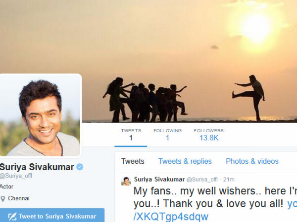 சூர்யாவோ ட்விட்டர் பக்கமே வராமல் இருந்தார். இந்நிலையில் தான் அவர் மகளிர் தினமான இன்று காலை 11.30 மணிக்கு ட்விட்டரில் இணைந்தார். முன்னதாக சூர்யா ட்விட்டரில் சேர உள்ளதை தெரிந்து கொண்ட ரசிகர்கள் அவரை வரவேற்று ட்வீட் போட்டு வருகிறார்கள்.