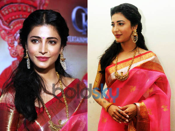 கெளரங் ஷா பட்டுச் சேலையில் பார்த்தவர்கள் குஷி அடையும் வகையில் தேவதை போல வந்திருந்தார் ஸ்ருதி ஹாசன். அவரை சேலையில் பார்த்த பலருக்கும், ஓகே, பொண்ணுக்கு மணப்பெண் களை வந்து விட்டது.. இனி அப்பா கமல் மாப்பிள்ளை தேட வேண்டியதுதான் என்று சிரித்துக் கொண்டனர்.